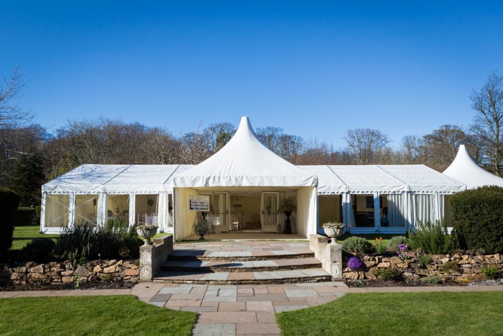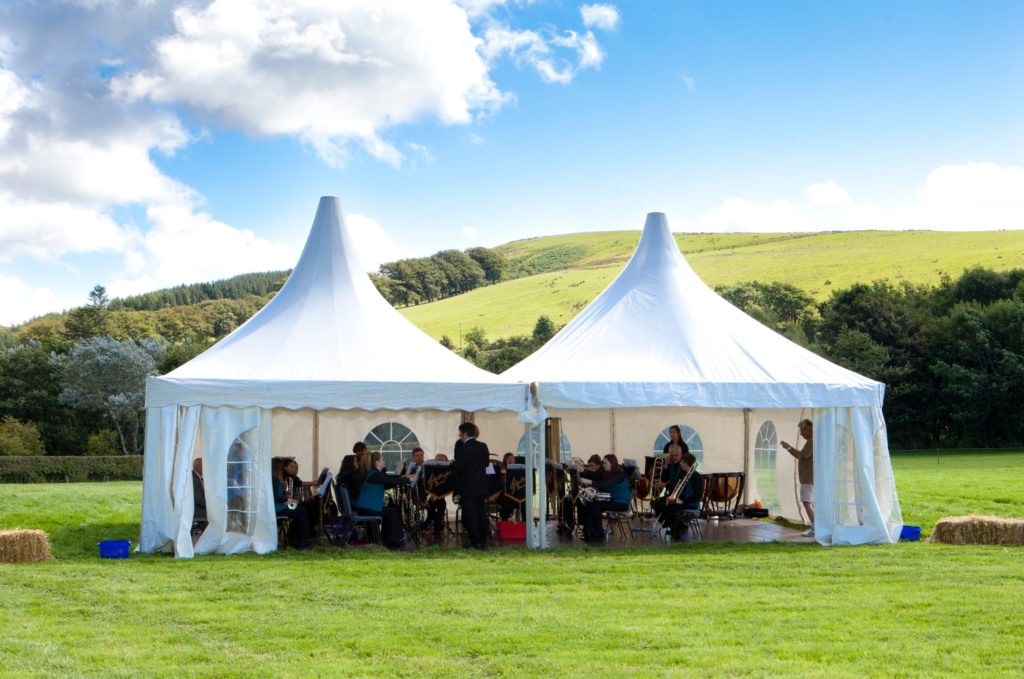 Often we bolt the pagodas onto to larger structures creating an excellent porch area, with flooring and ivory pleated lining they look like extensions of the main marquee, with a difference.